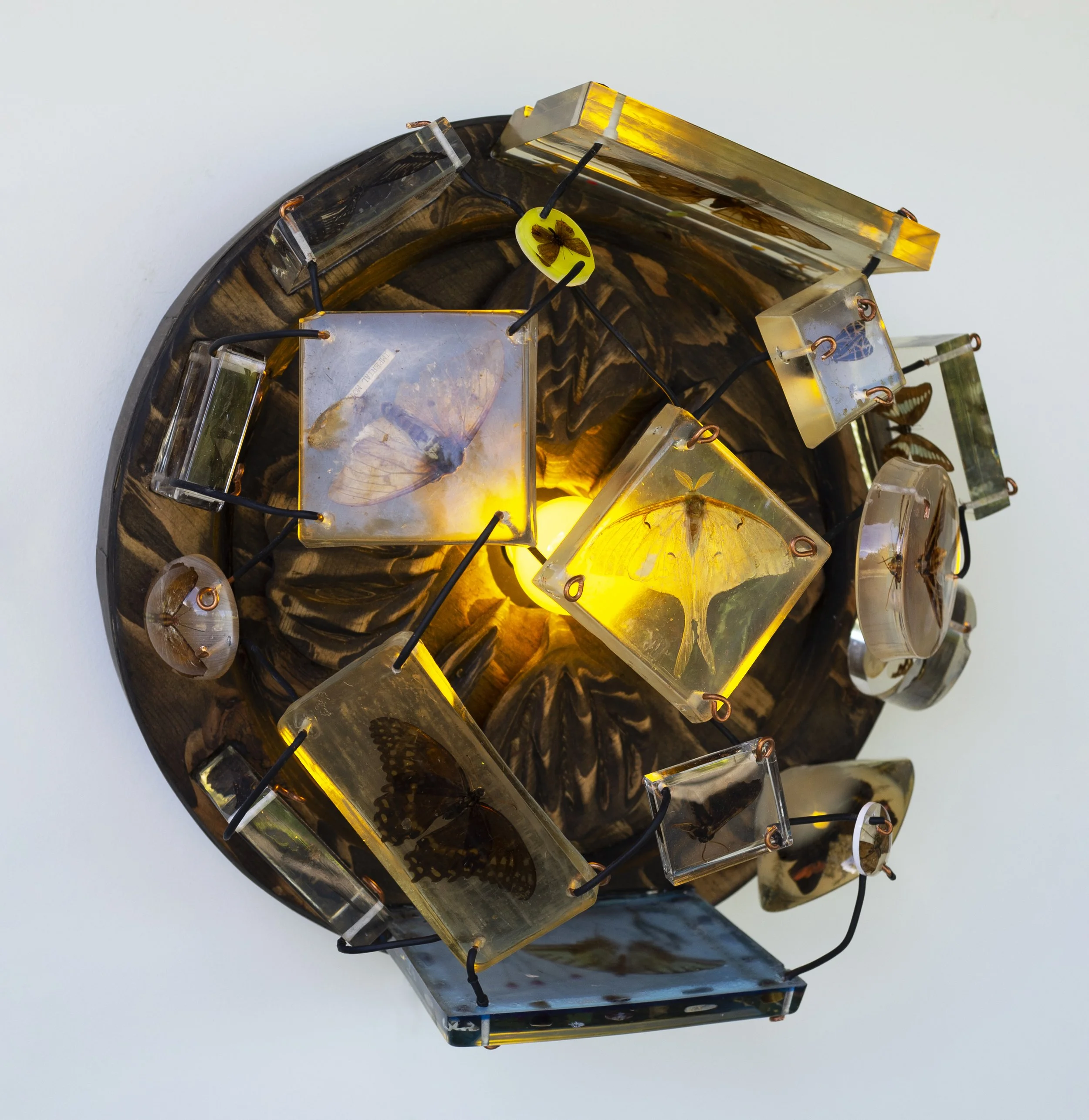 Forever Chrysalis, 2022, Found wood, vintage cast butterflies and moths, copper wire, rubber, bug attracting light bulb, adhesive, 16 x 16 x 10 inches. Caged in resin years before, these moths and butterflies are frozen in time, unable to return to the earth and become again. At the center of Forever Chrysalis stands two icons of these insect’s former lives: the form of a Fireweed flower, a super attractant for butterflies in the Pacific Northwest, and the glowing orb of a bug light, a friend of the nocturnal moth. $3,000