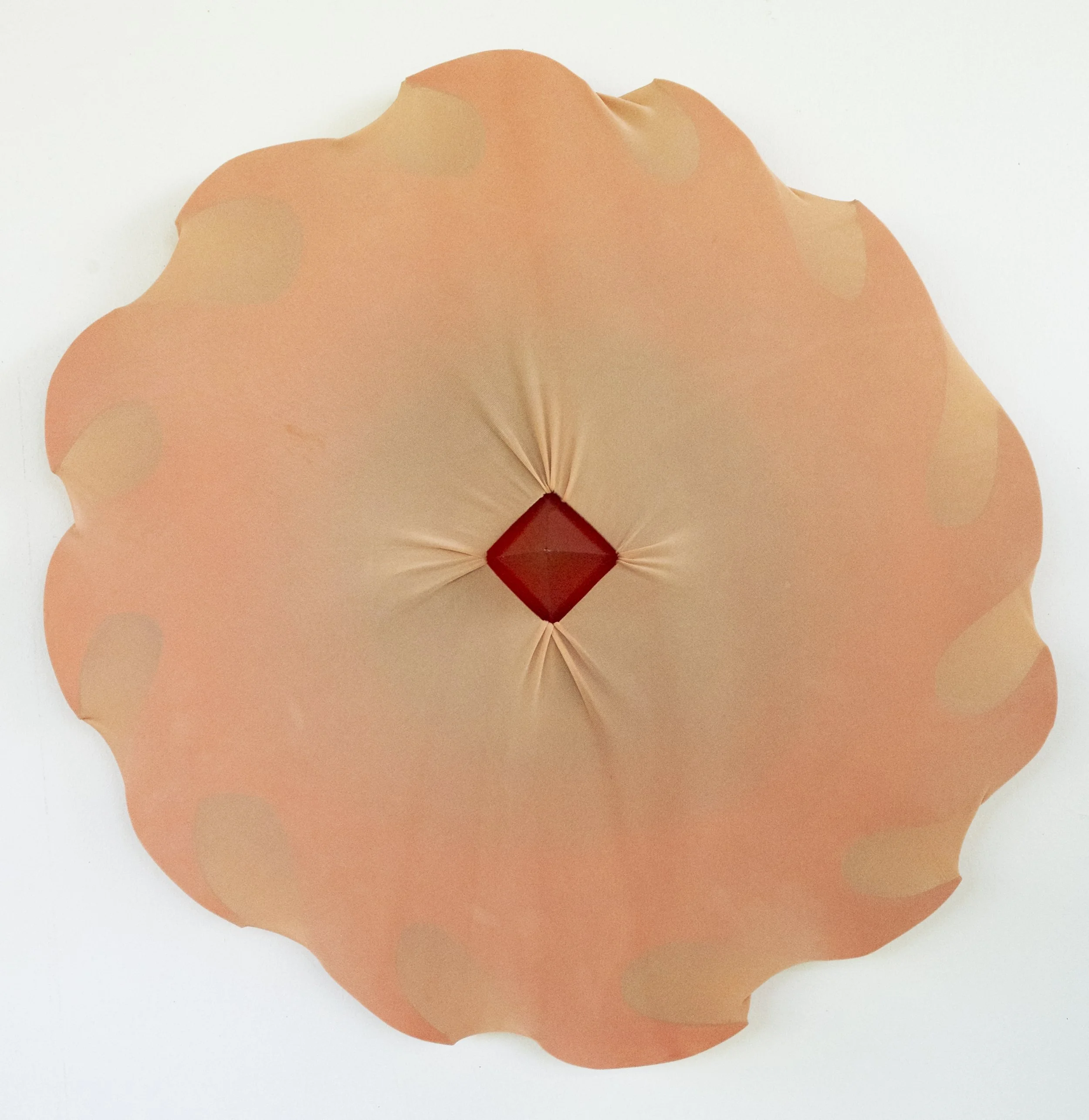 Twisted Breastbone, 2020, Acrylic on wood, found fabric, resin pyramid, 18 x 18 x 2.5 inches. A spiral, a saw blade with skin-like fabric pulled tightly around it portrays the spot within our chests where many of us hold our anxiety, our tension. $800.